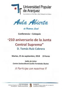En el día en el que se cumplen doscientos diez años de aquel hecho histórico acaecido en Aranjuez, el Aula Abierta de Historia Local de la Universidad Popular de Aranjuez abre este martes el curso 2018/2019 y presenta su IV ciclo de conferencias que se desarrollarán en el remozado salón de actos del Centro Sociocultural ‘Cecilio Fernández Bustos’, en el que han sido implantadas nuevas butacas, nuevo sistema de proyección y una cámara de video que permitirá grabar las diez conferencias que componen el ciclo.